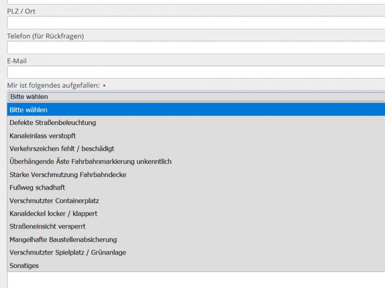 Sind Ihnen Mängel an Straßen, Lampen oder Verkehrsschildern aufgefallen? Haben Sie Verschmutzungen oder verstopfte Kanäle bemerkt? Helfen Sie uns bei der Beseitigung dieser Mängel, indem Sie uns diese mitteilen.